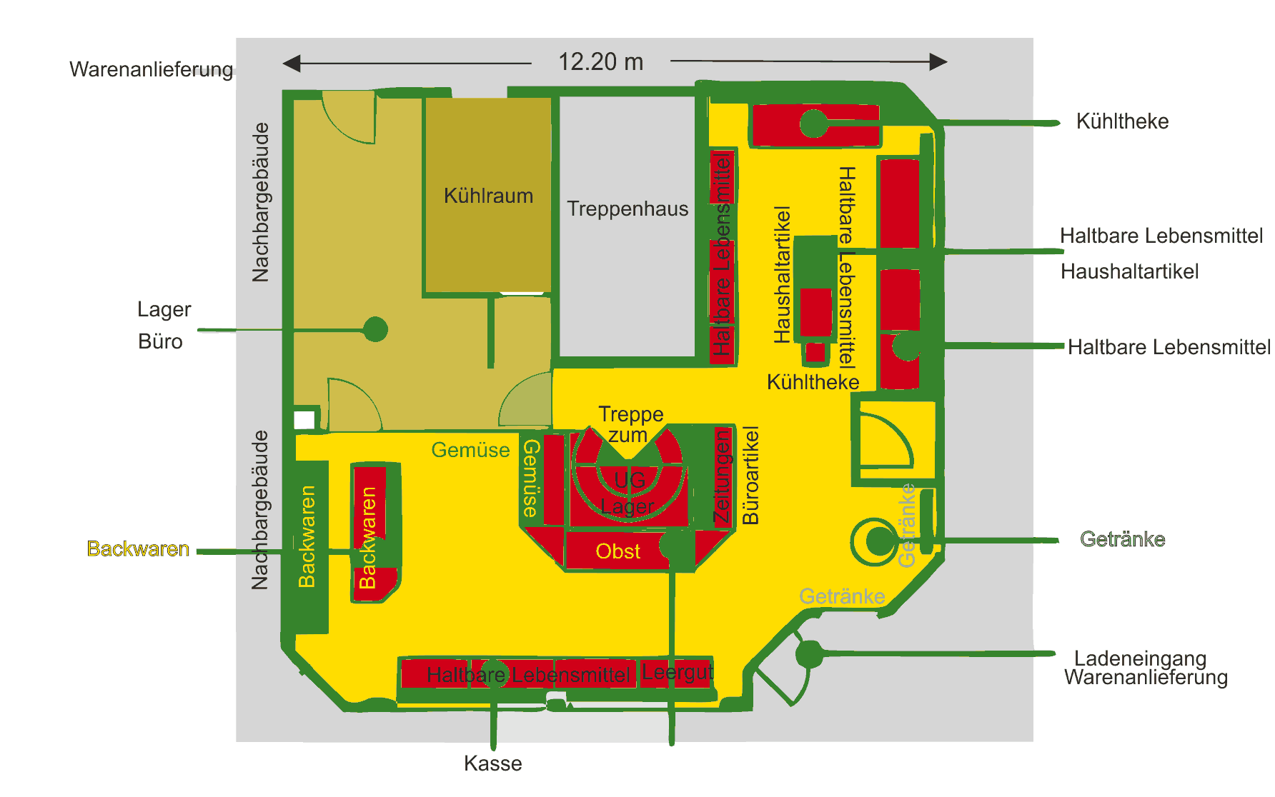 Die Einrichtung des Ladens (Regale, Kühltruhen, Bedientheke, Kasse, sowie Erstbestand an Waren) mit etwa 100 Quadratmetern kostet einmalig etwa 40.000 Euro.- Den Aufwand für Miete, Raumkosten, sonstige Kosten schätzen wir auf etwa 30.000 Euro pro Jahr.